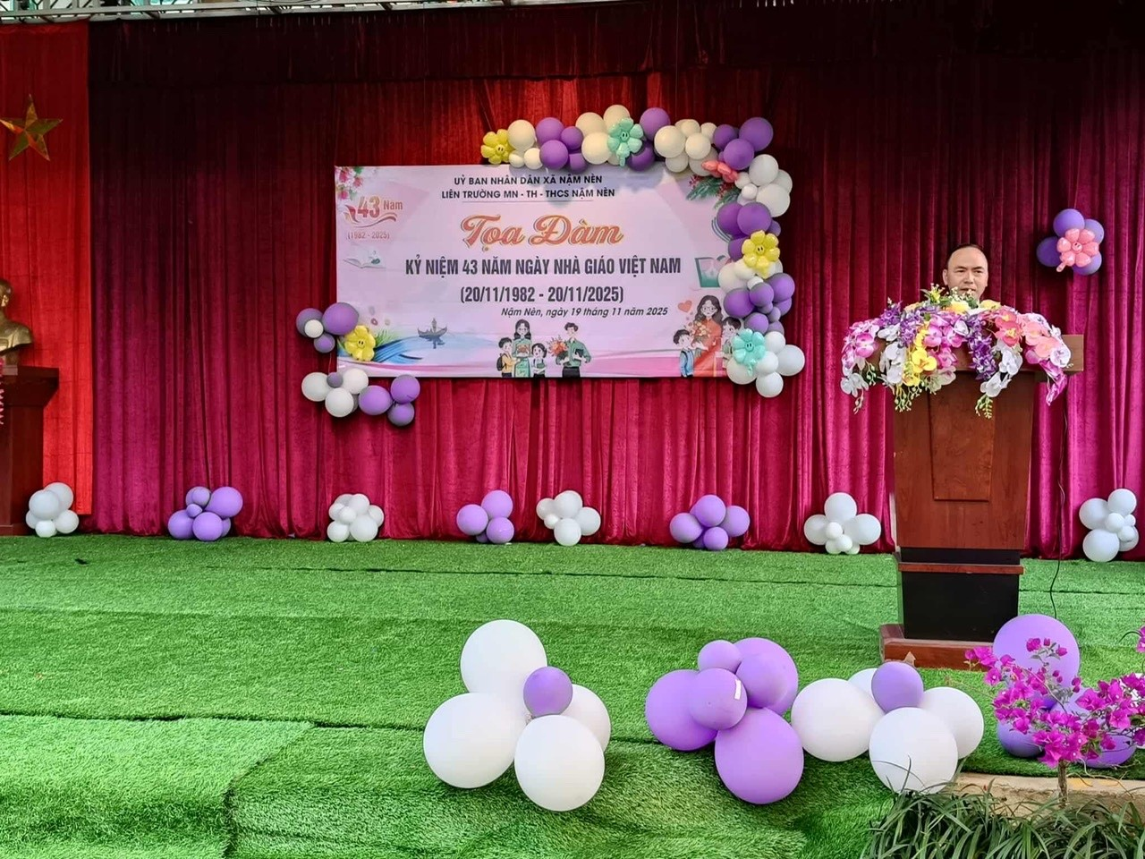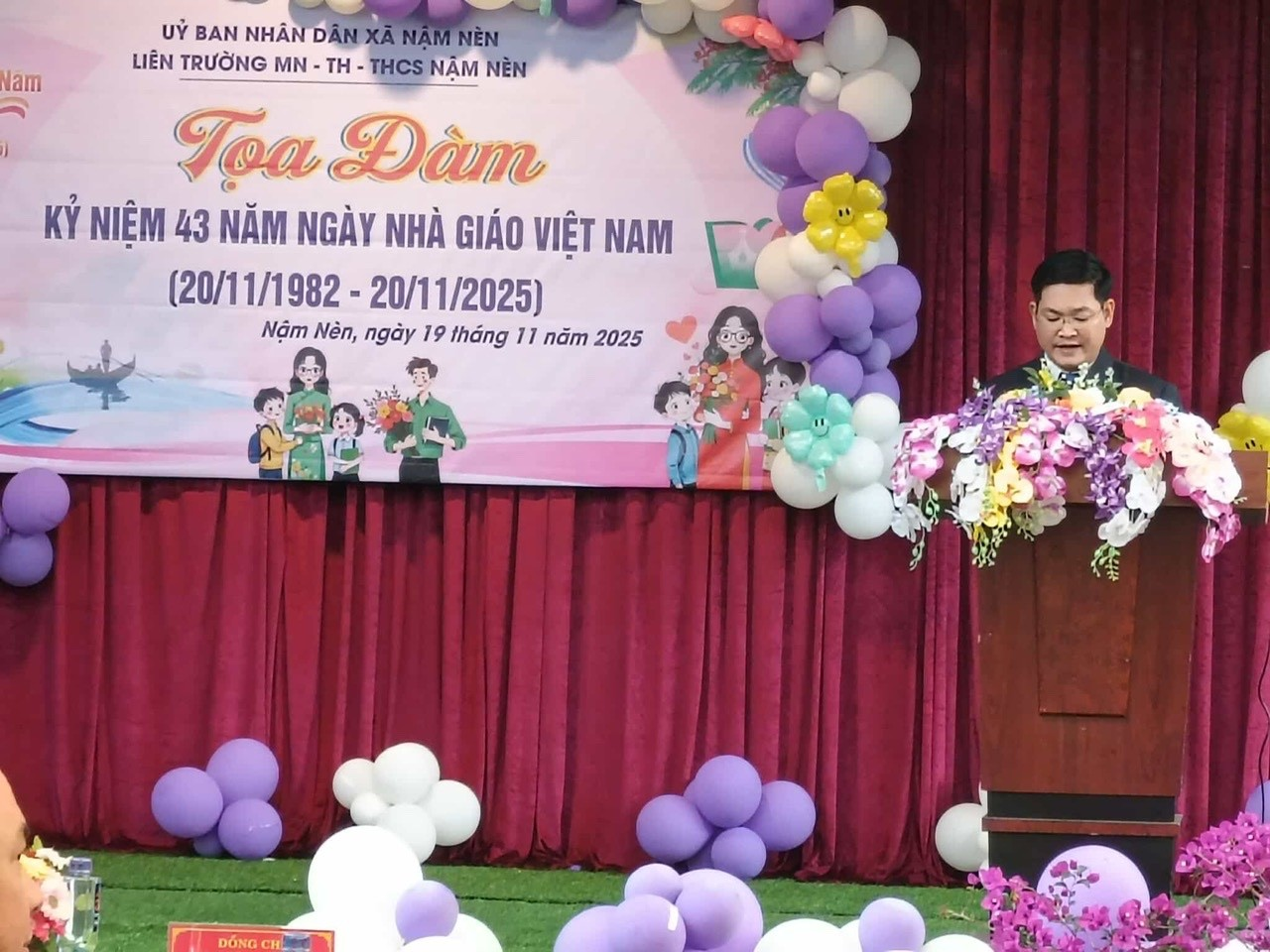 Để ôn lại truyền thống tốt đẹp của nhà giáo Việt Nam đồng thời báo cáo phát biểu khai mạc buổi tọa đàm. Thầy Vũ Xuân Tiền – Bí thư chi bộ, Hiệu trưởng trường PTDTBT TH Nậm Nèn Lên thông qua diễn văn khai mạc và ôn lại truyền thống ngày ngày giáo Việt Nam.