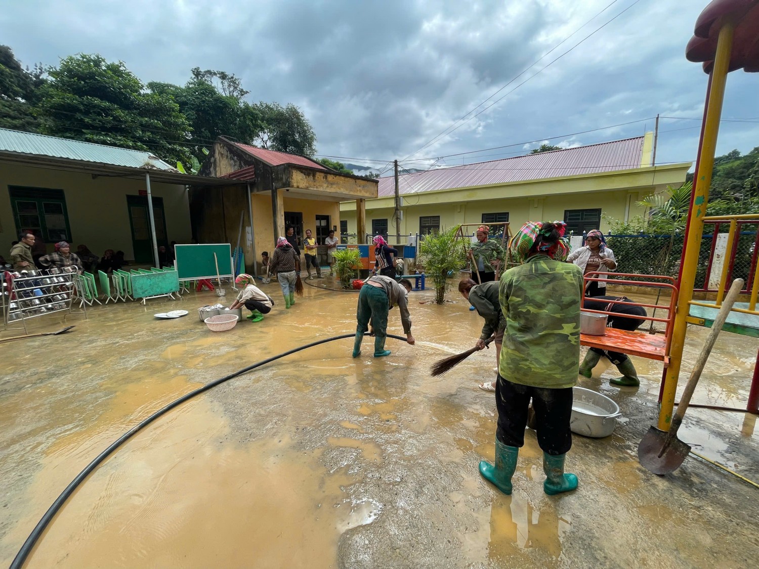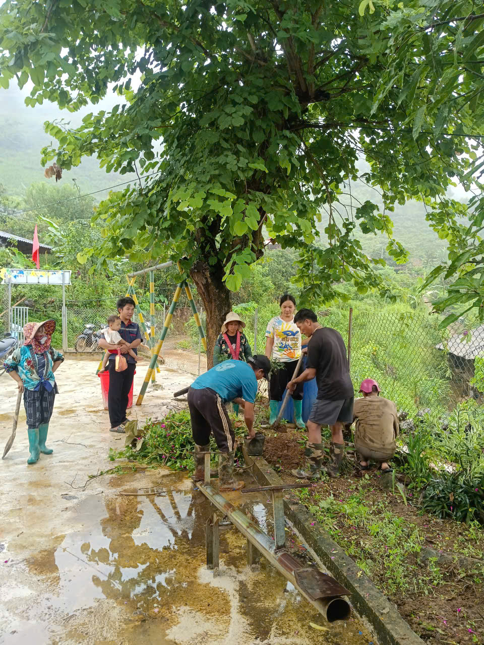 Ngay từ sáng sớm nhà trường đã bắt tay vào các phần việc cụ thể: quét dọn sân trường, phát quang bụi rậm, thu gom rác thải, lau chùi bàn ghế, dọn dẹp các phòng chức năng, trồng cây trồng hoa....Chỉ trong thời gian ngắn, khuôn viên nhà trường trở nên khang trang, sạch đẹp, đảm bảo môi trường an toàn, lành mạnh, sẵn sàng đón các bé bước vào năm học mới với nhiều niềm vui và hứng khởi. Các điểm bản cũng được các cô giáo vận động phụ huynh lao động và dọn dẹp. Sau 2 tháng nghỉ hè tại các điểm bản mưa gió xảy ra hiệ tượng ngập lụt, cây cỏ rậm rạp cũng là bước khởi đầu khó khăn và vất vả cho các cô giáo. Nhưng với lòng hăng say và yêu nghề mong muốn có 1 môi trường tốt nhất để chào đón các con thì các cô giáo đã tập trung công việc rất cao và đạt được kết quả tốt: Sau đây là những hình ảnh lao động dọn dẹp của các cô giáo và phụ huynh trong trường: